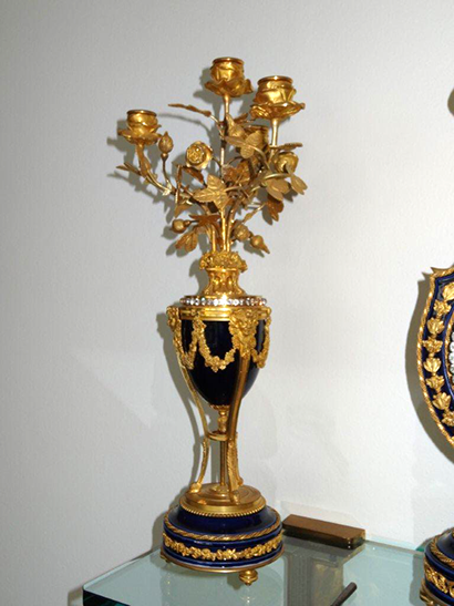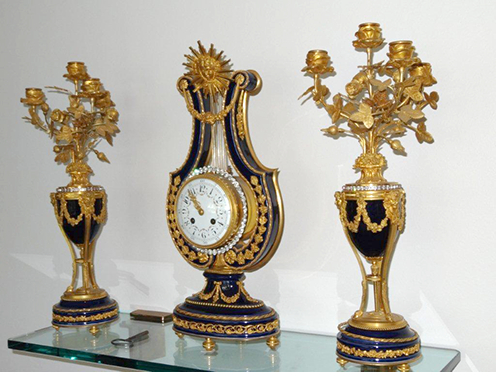 An very attractive French ormolu mounted Louis XVI style blu Sevre marble clock garniture. The enamel dial decorated with garlands of flowers and beautifully pierced and engraved gilt hands. With paste-set pendulum circle set around the dial and with a brass and steel pendulum rod.