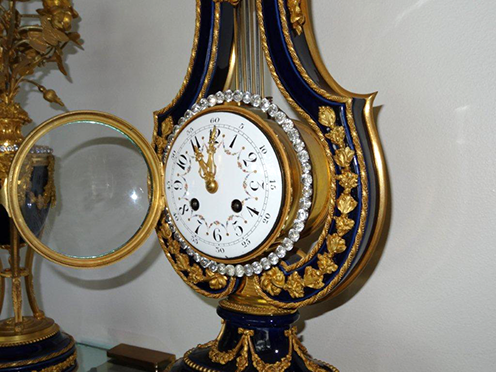 The bleu Sevre porcelain lyre shaped case with gilt-brass decorative floral mounts and an ormolu sunburst to the top and standing on gilt bun feet.